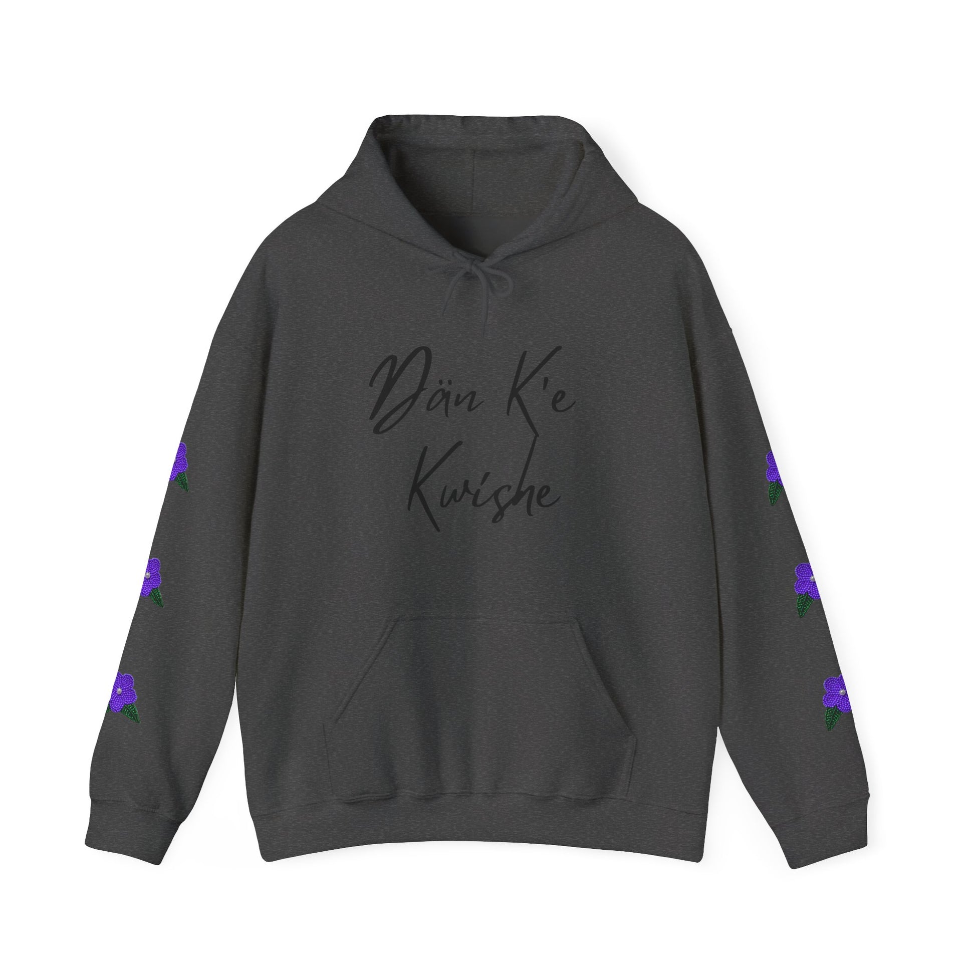 The "Dän K’e Kwíshe" Purple Flower Hoodie, made from a soft cotton-poly blend, provides warmth and durability. Its unisex fit offers everyday versatility, with ribbed cuffs and hem to keep the shape intact. A large front pocket adds convenience, while the double-lined hood with matching drawcord gives it a clean, cohesive look. Trusted for custom printing and casual wear, the Gildan 18500 is a reliable choice that balances comfort and longevity.